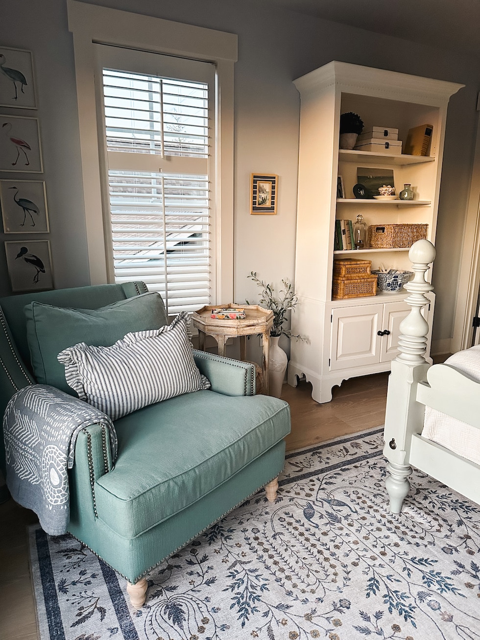 fuente de alfombra // cortinas a cuadros (color cambray) // Manta estampada en los brazos de la silla (¡Lavable a máquina por ambos lados!) // patas de silla de madera // almohada con volantes a rayas // arte de aves // marco de latón