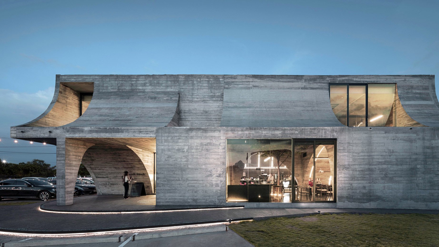 Internamente, las paredes arqueadas de hormigón están iluminadas por esbeltas luces LED, que enfatizan su forma, mientras que las ventanas arqueadas ofrecen vistas al exterior.