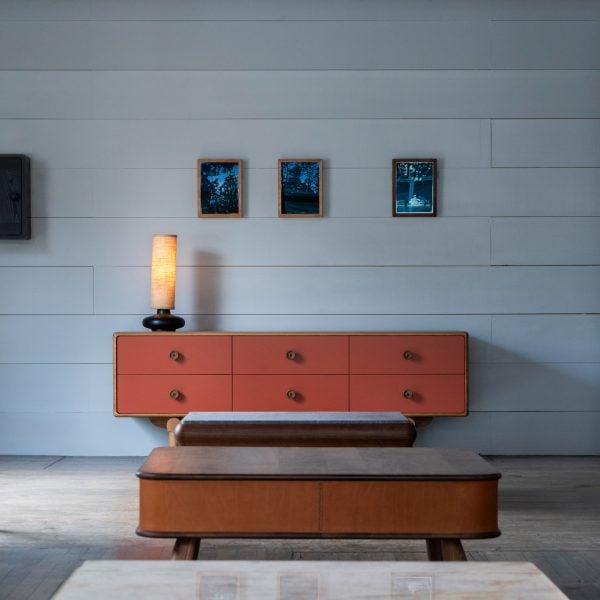 Diseñadora y educadora Jennifer June Studio partes sueltas Exhibiendo tocadores, sillas, consolas y asientos al aire libre como parte de ella. El sitio es una cantera. exposición, ubicada en su sala de exposición y estudio de Catskill.