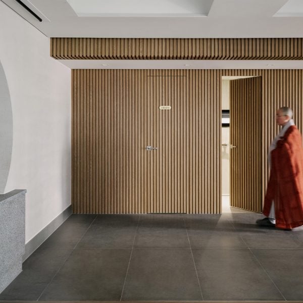 La forma de líneas limpias del edificio, marcada por ventanas cuidadosamente colocadas y una paleta de materiales minimalista, rinde homenaje a la arquitectura tradicional del templo.