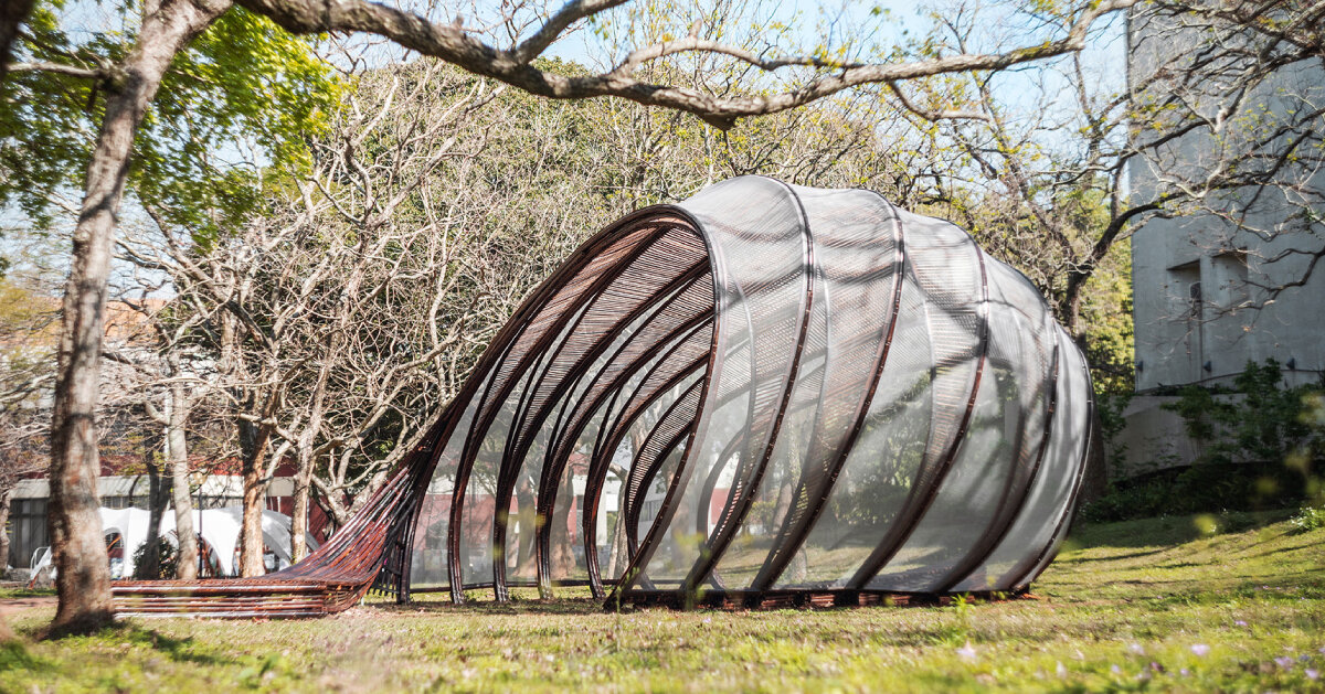 Zeng Lingli pabellón rodante incorpora materias primas bambú Combinado con la estética de la fabricación digital, demuestra cómo las plantas se pueden utilizar para expresiones nuevas e innovadoras. Ubicado en el campus de la Universidad Nacional Yang-Ming Chiao Tung TaiwánSu amplia estructura utiliza nueva tecnología que permite que el bambú se eleve hasta 8 metros de altura.