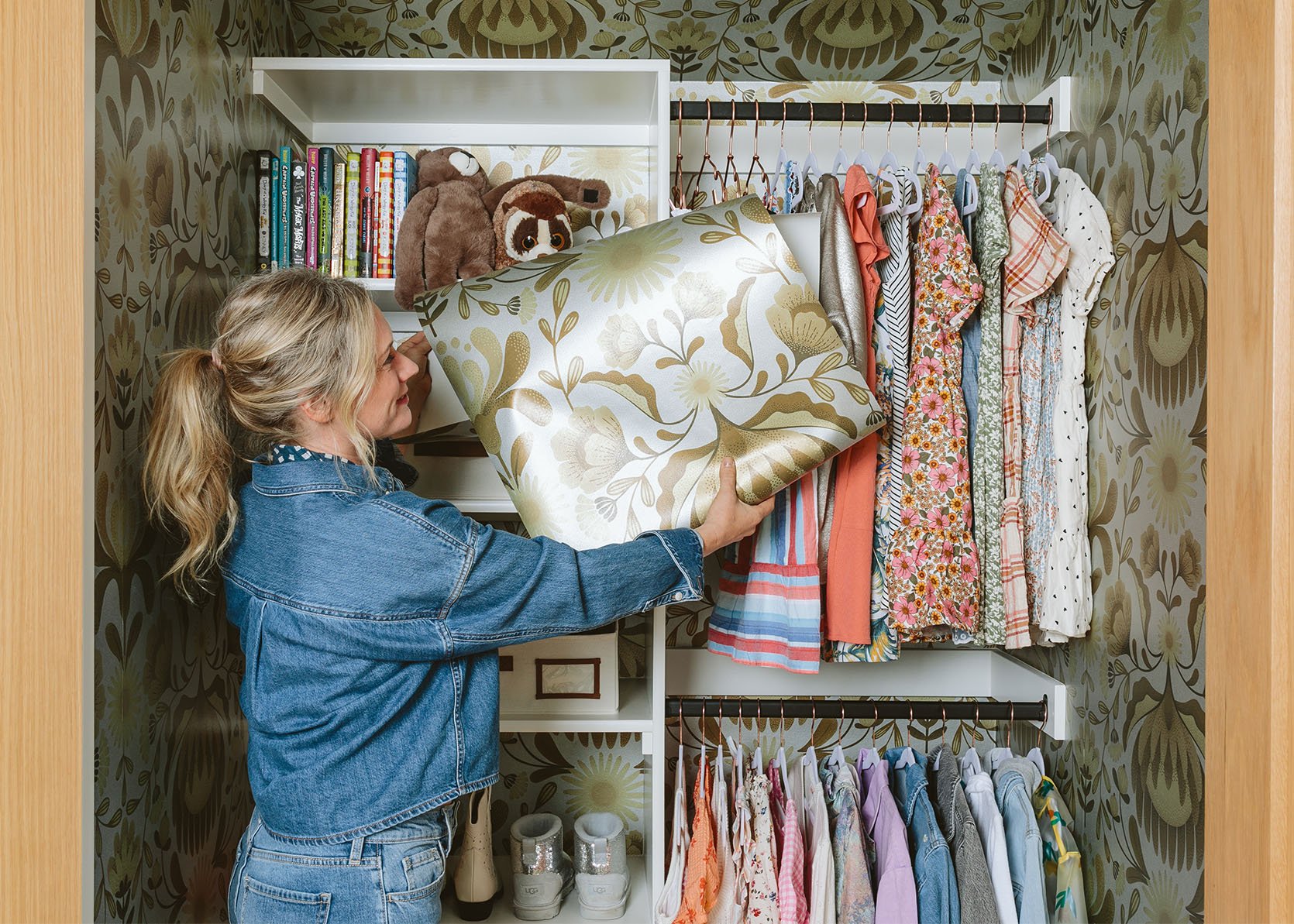 Un consejo divertido para las mamás es que el armario es un gran lugar para dejar que su hijo elija algo un poco más salvaje y divertido. Si bien no creo que este patrón y combinación de colores sean tan peligrosos, mi «cliente» está nervioso por usarlo por toda la habitación, principalmente por el bien de la atemporalidad. Pero aquí, cada vez que abre su armario, es divertido y ligero, con muy poco riesgo (y la opción de despegar y pegar lo hace aún menos riesgoso).