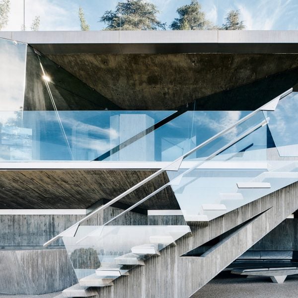 Hay una cancha de tenis en la parte superior del edificio, que conduce a una terraza de concreto que rodea un área de salón y biblioteca, y una terraza de piscina en voladizo con escaleras de concreto que conducen a los exuberantes alrededores.