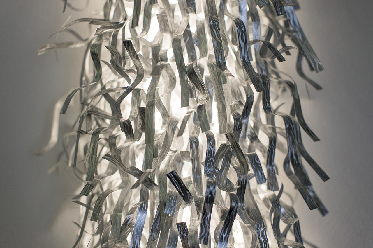 Utilizando materiales clásicos como cuentas de vidrio, lentejuelas, plexiglás y tiras de PET cortadas con láser, el objetivo era observar cómo reacciona la pantalla de luz al chocar contra estas texturas impredecibles. Las piezas finales que componen HABITUS incluyen piezas metálicas semiacabadas con cuentas de colores, cortinas realizadas con miles de cuentas de vidrio e instalaciones con rizos de PET tratado térmicamente. Lo que todos tienen en común es la luz y un ligero efecto visual digital.