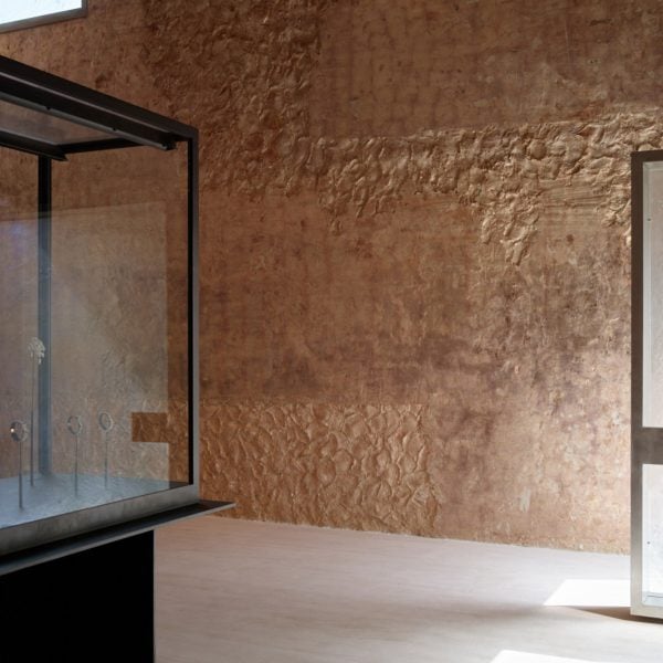 En el centro del museo hay una sala de exposición principal de siete metros de altura con paredes de yeso cubiertas con láminas de plata, que reaccionan con el aire y la humedad para crear una pátina dorada en el interior. Los tragaluces aportan luz al espacio.
