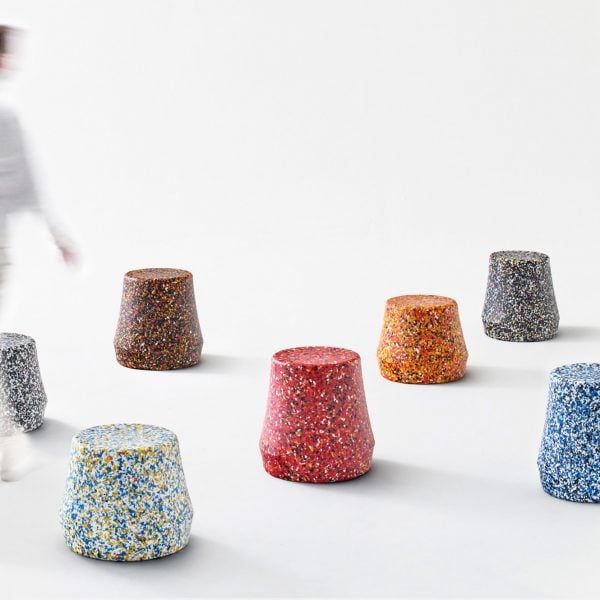 Esta selección incluye marco en A. heces Hecho de madera que normalmente se desecha, otro taburete con aspecto de terrazo elaborado con restos de colores Plástico reciclado.