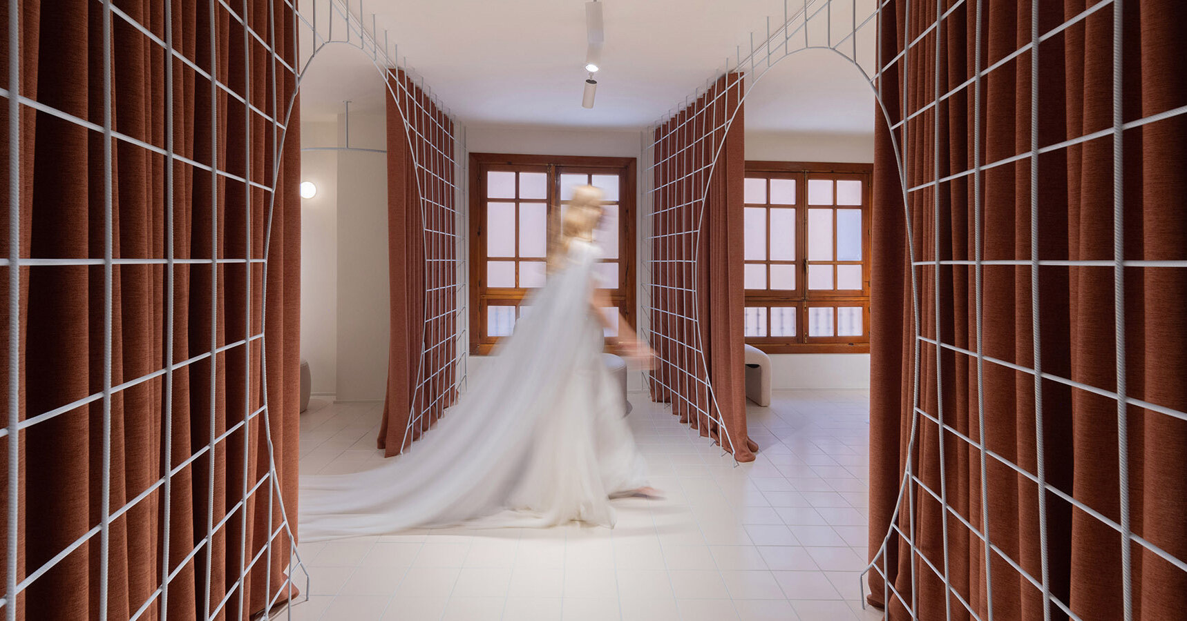 L’AURA ORTÍN Arquitectura estrena ropa Maison Portocale comercio En Murcia, España, redefiniendo la experiencia común de compra nupcial. El diseño presenta una serie de probadores flexibles con cortinas de terracota y paredes de malla corrugada que contrastan con delicadas texturas de brocado, muselina y seda. Para albergar desfiles de moda improvisados, el espacio se puede transformar de un área de prueba privada a un desfile de moda abierto. La colocación inteligente de los espejos puede crear infinitos efectos y mejorar la profundidad de un espacio.