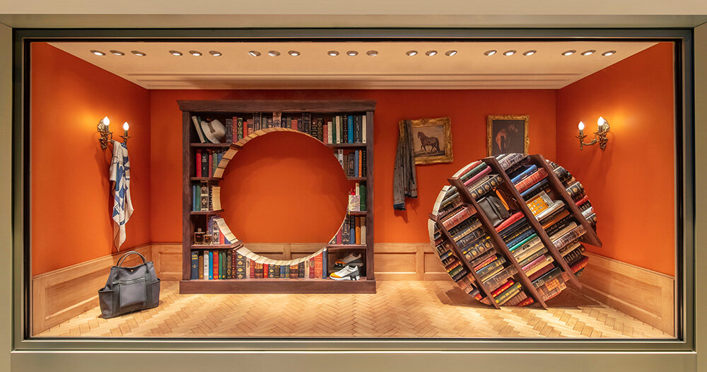 La entrada a través de las estanterías hace referencia a la dirección histórica de Hermès en París.