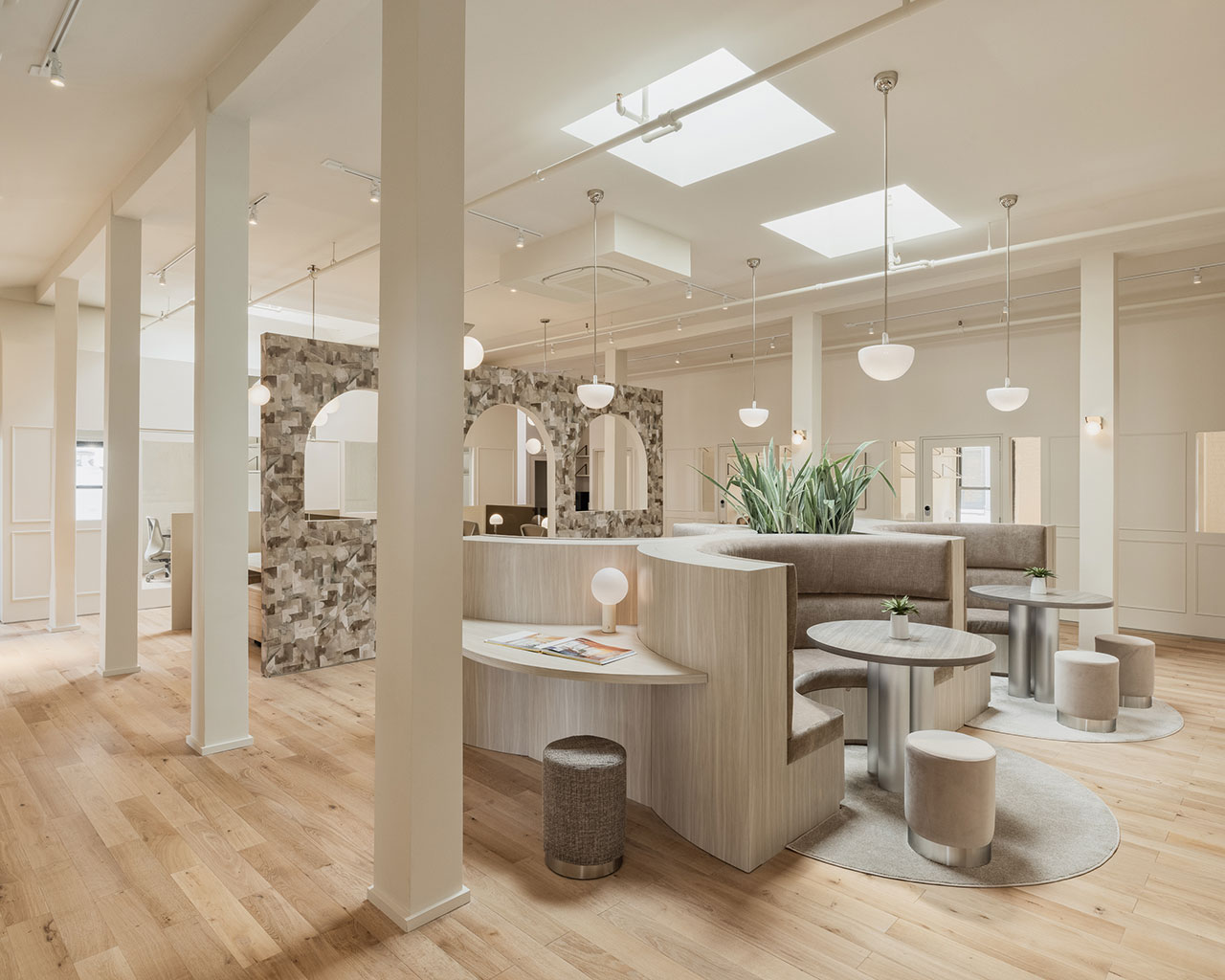 Complementando los tonos cálidos y neutros se encuentran aromas terrosos característicos y muchas oportunidades para conectarse con la naturaleza. “Hay un mayor enfoque en la salud y el bienestar en el lugar de trabajo”, dijeron Fanny Abbes y James Davison, directores creativos y socios codirectores de New Project Group, respectivamente. “Para respaldar esto, se han incorporado plantas y otras áreas verdes. Se han instalado grandes tragaluces de gran tamaño para complementar otras fuentes de luz natural y proporcionar una fuerte conexión con el mundo exterior. «Este volumen central proporciona el acceso más directo a los espacios públicos, distribuidos en diversos grados alrededor del perímetro. Sala privada.