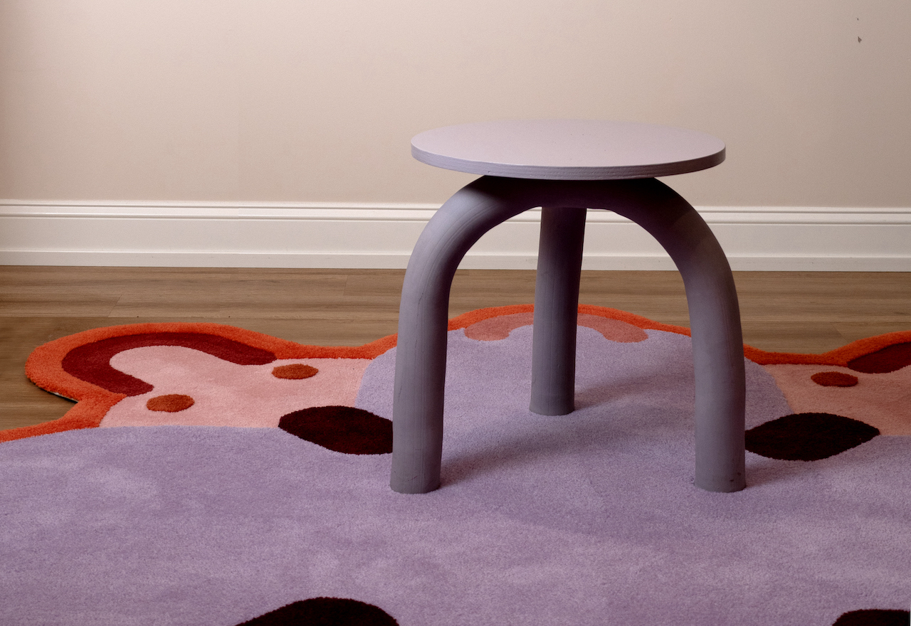 Una pequeña mesa redonda de color púrpura con patas curvas se alza sobre una colorida alfombra con un patrón abstracto en una habitación minimalista con paredes beige y suelos de madera.