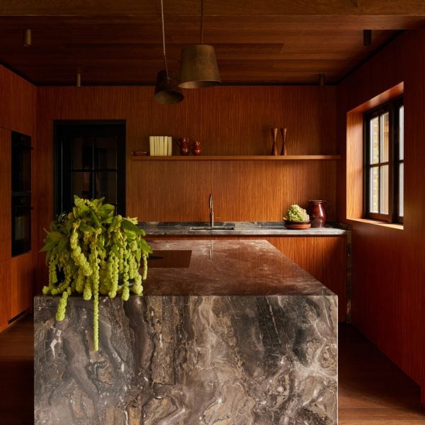 FMD Arquitectos Diseñó una casa de campo en el campo. Tasmania La cocina y la sala de estar están revestidas de madera contrachapada y separadas por una exclusiva estufa de leña.