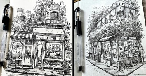 06-Tienda de lectura y bebidas-Arquitectura-Cuaderno de bocetos-Dibujo-1Way-www-designstack-co