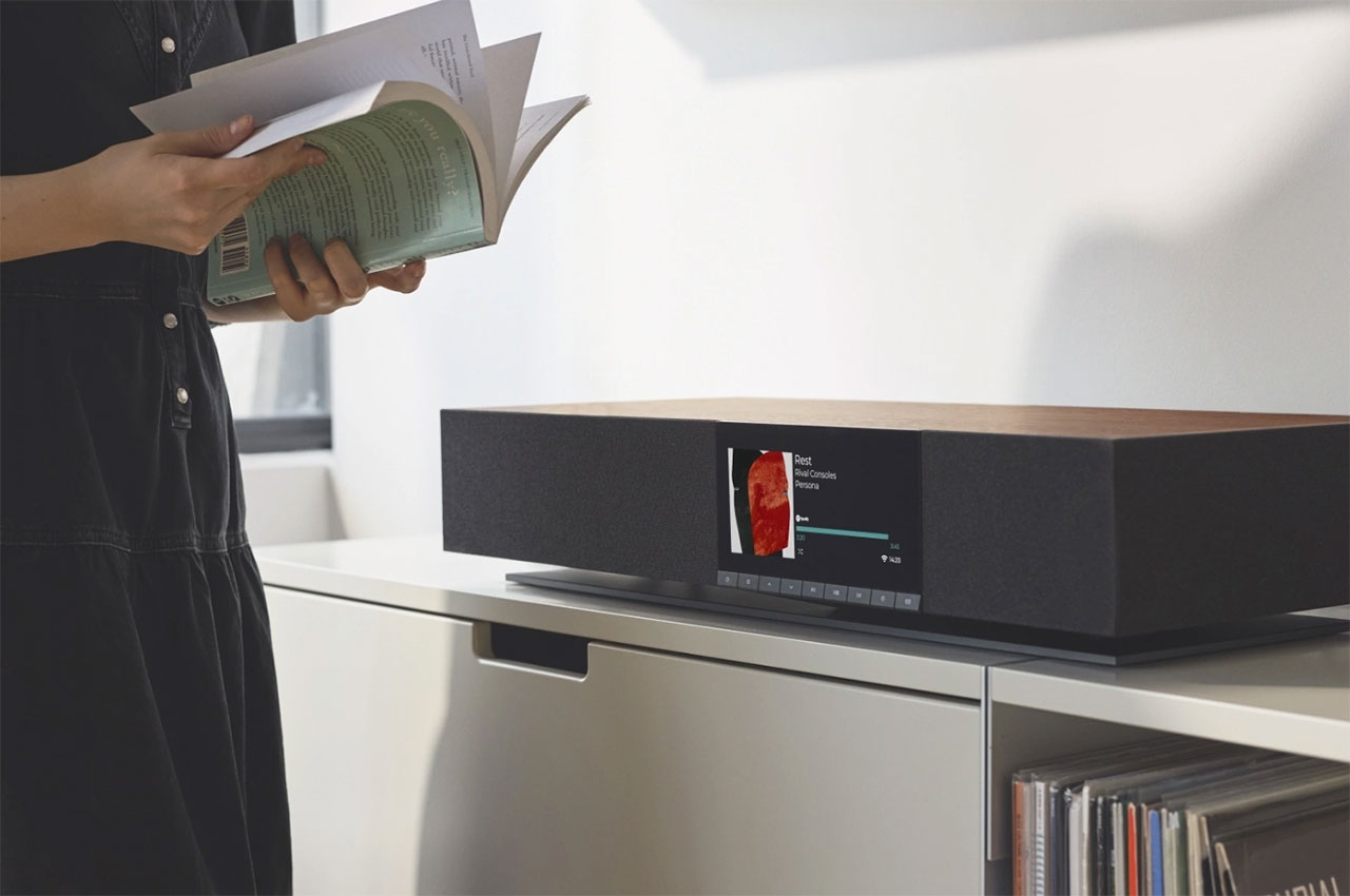 Uno usa un medidor analógico para ajustar los botones de un sistema de sonido de madera Cambridge Audio Evo One, mientras que otro lee un libro en un sofá al fondo.