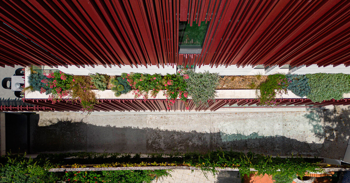La piel cubierta de madera roja abraza la fachada Art Nouveau de la villa del Parque Aveiro