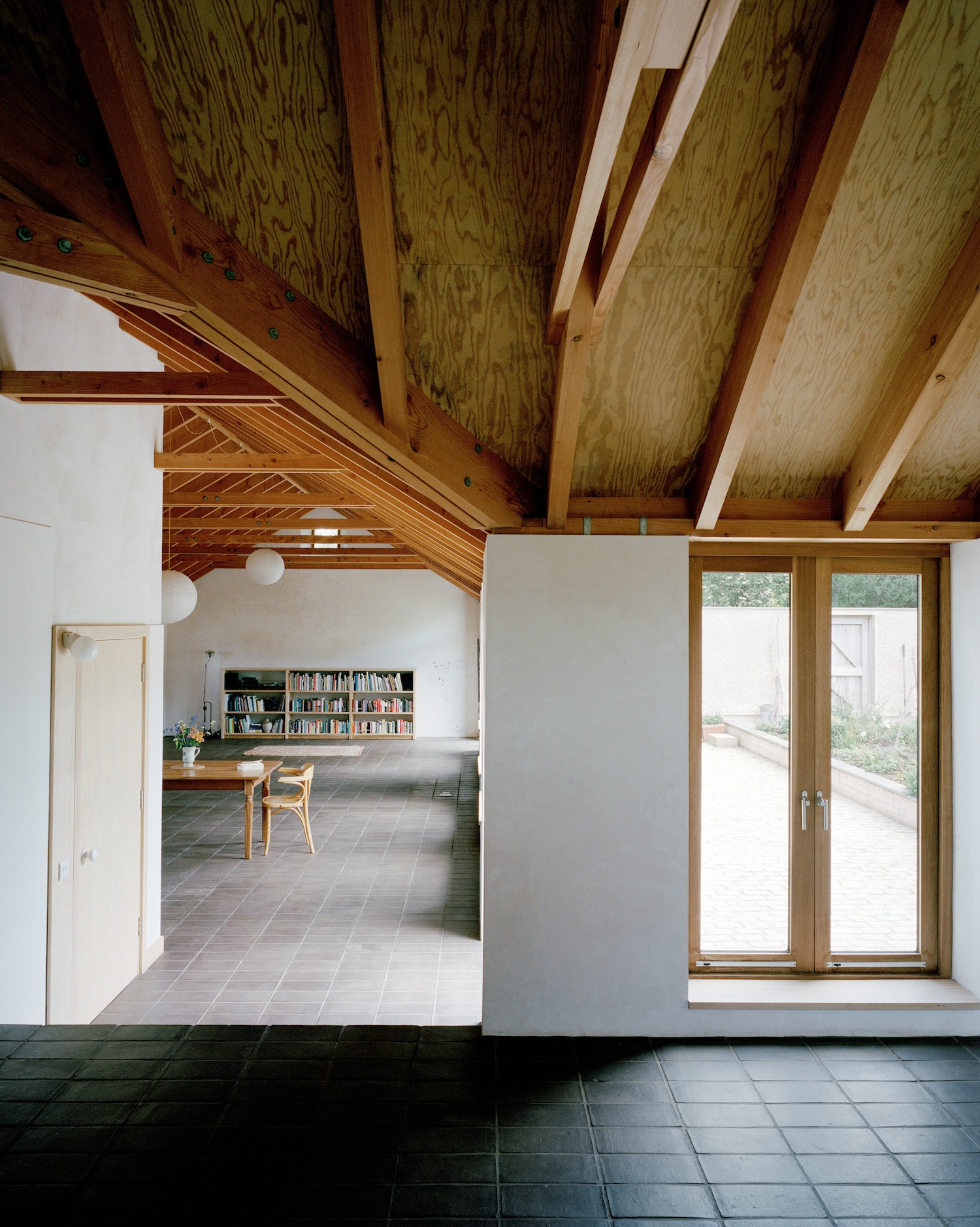 Esta división permite que los campos circundantes sean pastados hasta los muros exteriores, protegiendo así el paisaje agrícola. Los gruesos muros de mampostería de la casa, construidos con bloques de arcilla individuales, brindan soporte estructural y aislamiento. Los ladrillos tienen una estructura alveolar y están revestidos con cal texturizada en el exterior y estuco de cal en el interior, lo que garantiza que la casa sea cálida y respirable. El ala protectora de la casa está cubierta con un tejado uniforme de madera, que recuerda a las tradicionales estructuras de granero de la zona. La eficiencia energética fue un aspecto clave del diseño, con calefacción por suelo radiante proveniente de una bomba de calor geotérmica conectada a cables que pasan por debajo del sitio adyacente. Este enfoque sostenible crea una conexión directa pero discreta entre el hogar y la tierra.