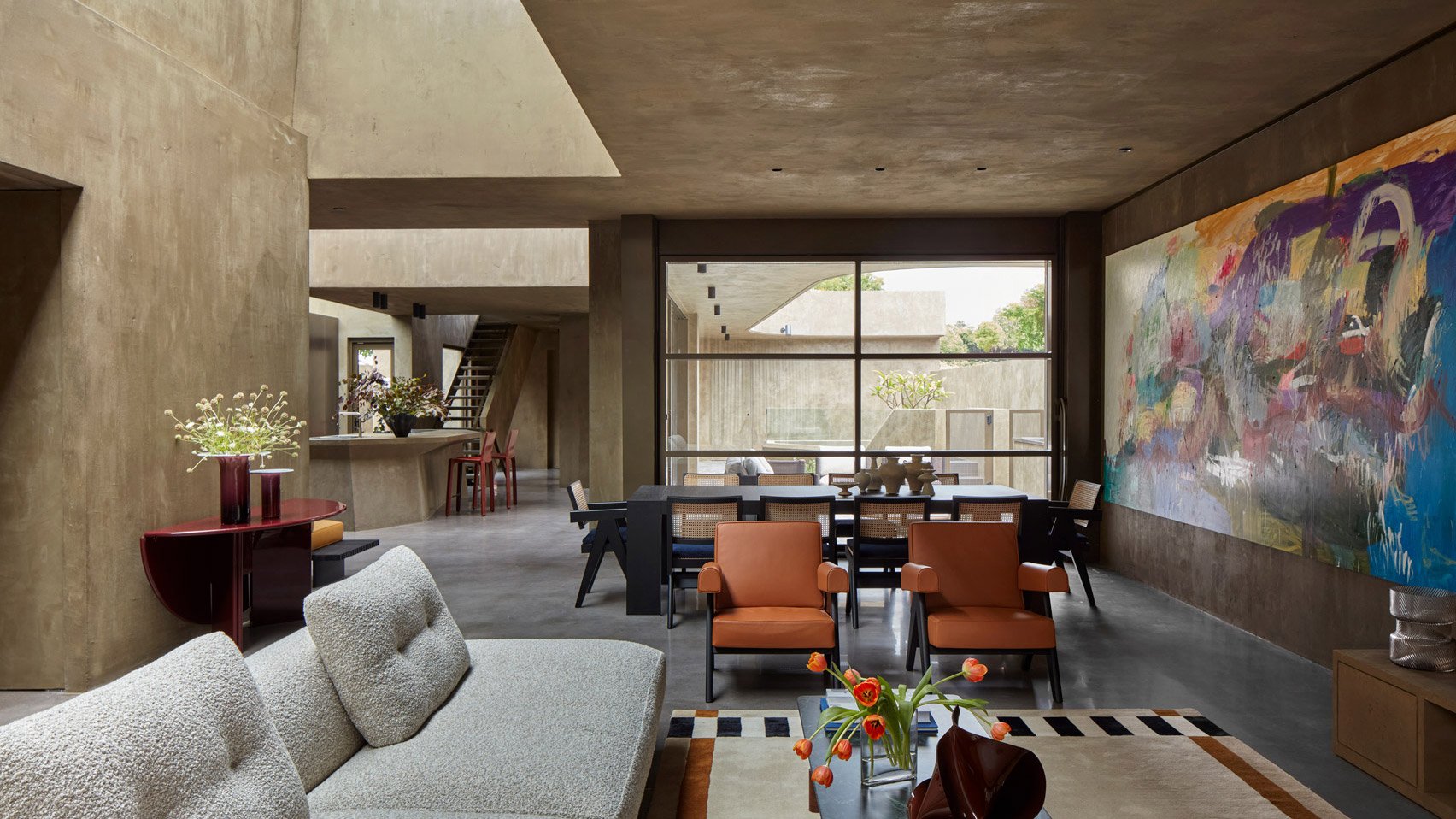 Se utiliza una paleta de materiales minimalista de enlucidos de cáñamo, molduras de aluminio y hormigón pulido, combinados con muebles, obras de arte y accesorios coloridos, incluidas piezas de los diseñadores Gerrit Thomas Rietveld, Charlotte Perriand y Joris Poggioli.