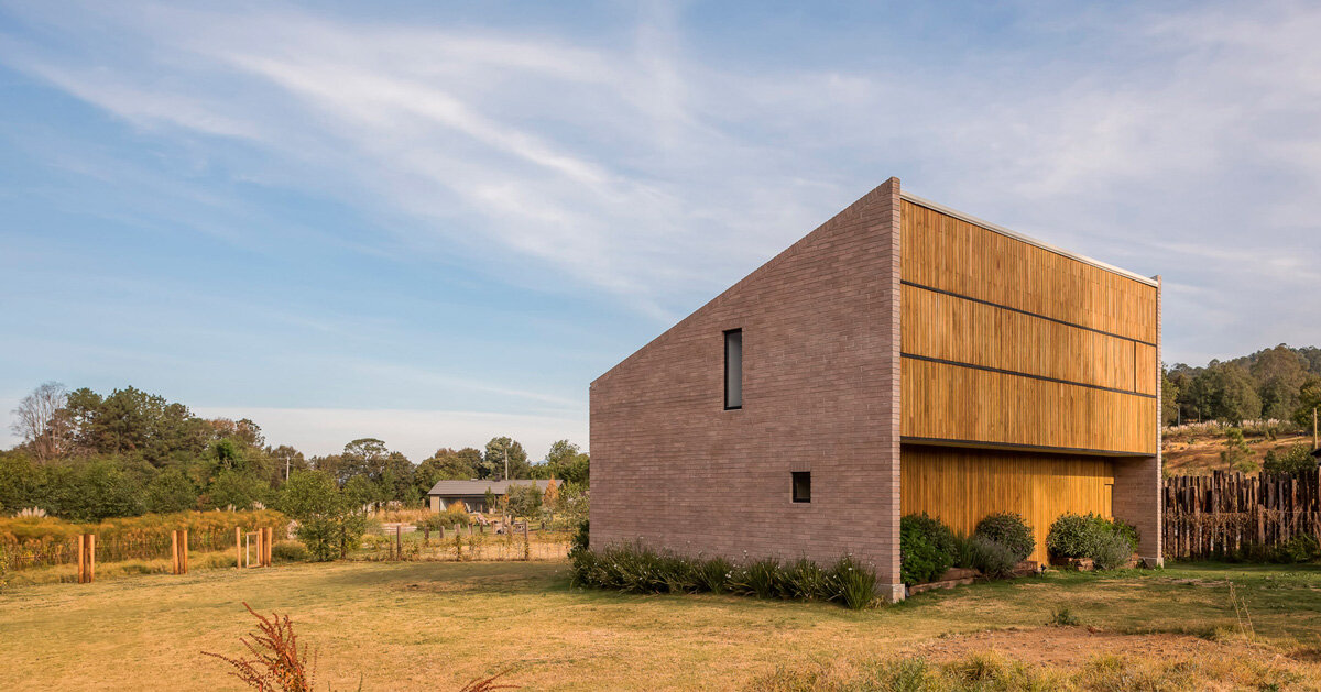 estudio atemporal crea una pequeña casa geométrica de ladrillo en un paisaje rural mexicano
