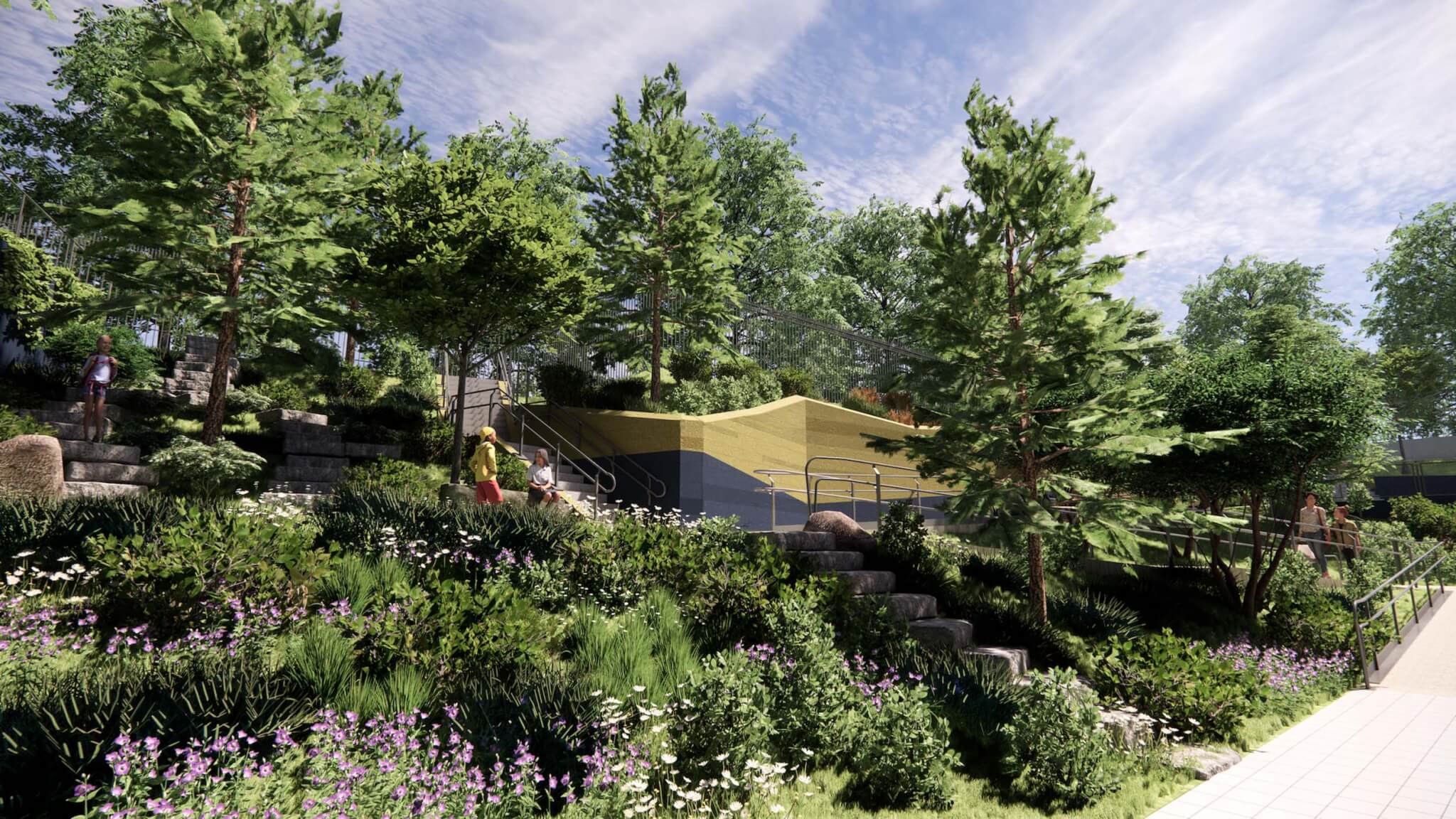 La ladera tiene una caída de 18 pies, está formada principalmente por muros de contención y estará cubierta con plantas nativas. Toda la vegetación es típica de la vida vegetal que se encuentra enterreno empinado”, incluidos prados, pastos ribereños y pinos. presione soltar Siguiendo las recomendaciones del Departamento de Diseño y Construcción, se plantarán 20 especies de plantas, 41 especies de árboles y más de 800 especies de arbustos.