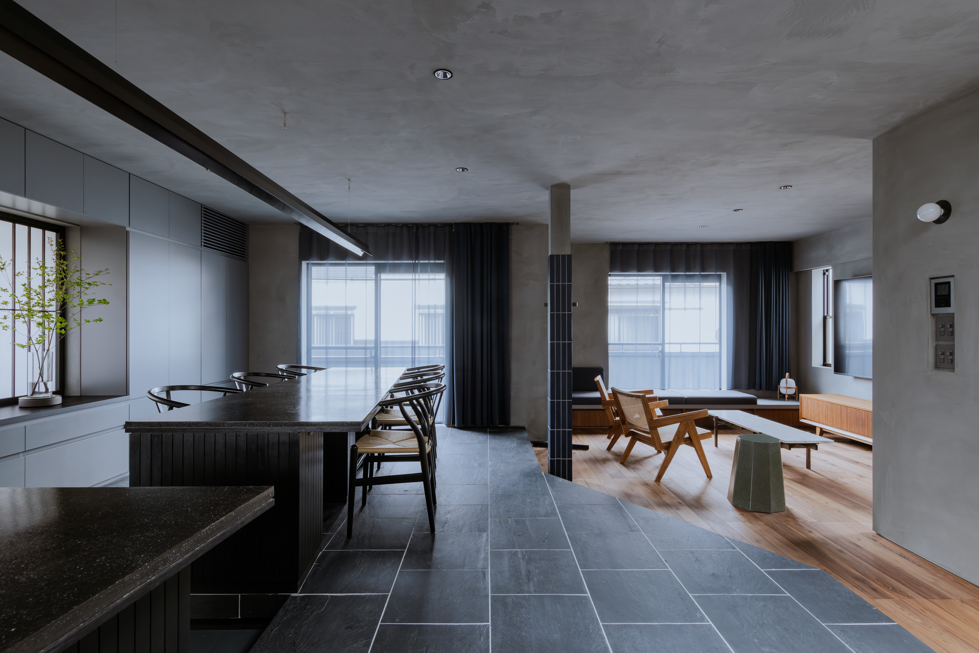 A diferencia de ese dormitorio privado, el resto del espacio está acabado en mortero y está diseñado para permitir que la hermosa luz del sol entre a raudales desde el tragaluz. El mostrador en el frente del segundo piso conecta el área del comedor y la cocina en línea recta, y la iluminación personalizada de 5 metros sobre él se extiende hacia afuera. El diseño está inspirado en el gesto de oración, que simboliza la consideración del cliente hacia sus invitados.