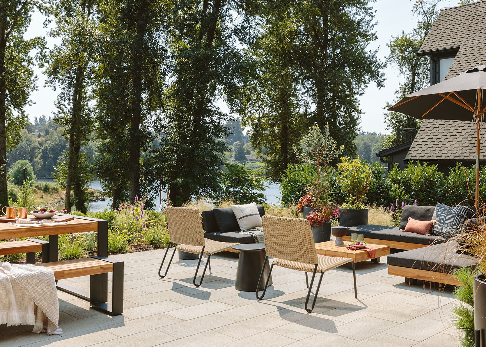 Lo curioso es que la empresa de paisajismo (pistilo) diseñó el patio con esta sección (llamada espinilla). En realidad, esto está en su esquema. Estuve de acuerdo… y di un paso más. Es de muy bajo perfil, lo que permite que la vista de la sala de estar siga siendo muy abierta (en lugar de simplemente mirar un montón de muebles). También es muy bajo, lo cual es una ventaja porque hay algunas vistas feas que ni siquiera puedes ver cuando estás sentado tan bajo; extrañamente bloquea esas vistas y permite que todos vean las hermosas vistas del río y los árboles. También puede albergar a un gran número de personas. Se adapta muy bien al estilo del hogar. Fue hecho para esta casa.