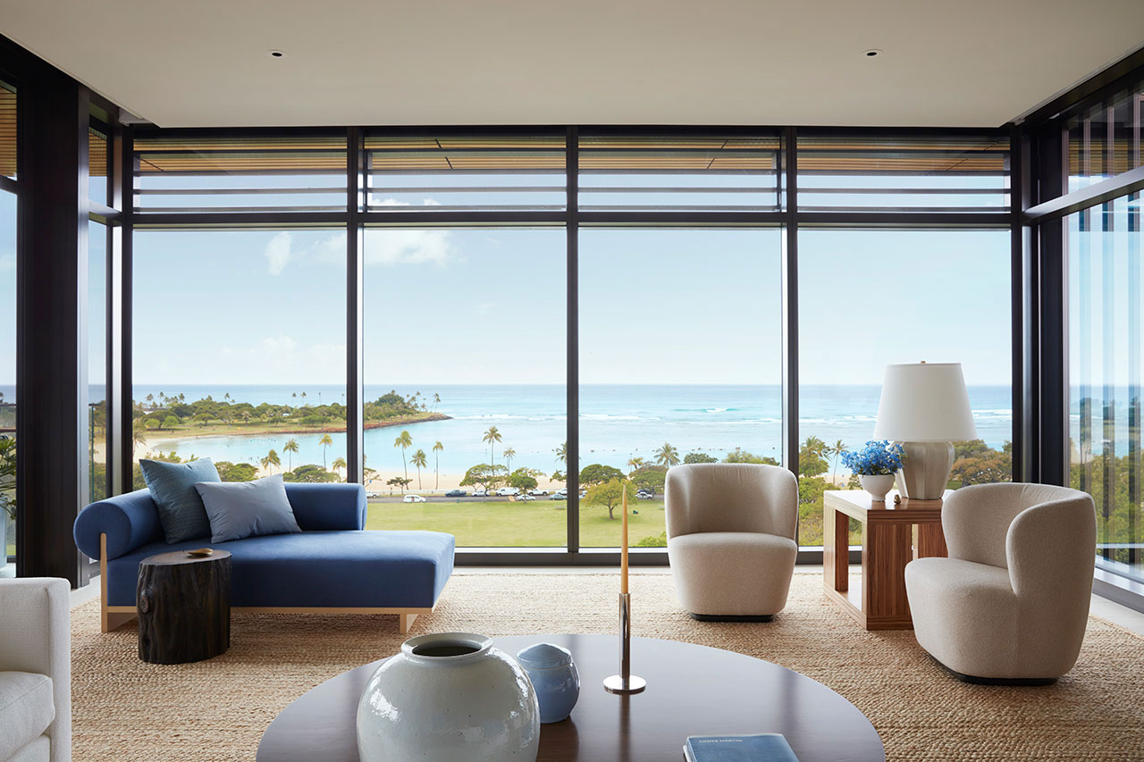 El proyecto más popular actualmente es The Launiu Ward Village, que es la culminación de un viaje para aprender sobre las islas hawaianas. Las paredes exteriores de la torre ondulan como talladas por el viento de Kona. En respuesta a este contexto, moldeamos cuidadosamente la experiencia de entrada del edificio, enmarcándola con lava natural y piedra de coral, textiles tejidos y maderas cálidas. \\\ Foto: Suministrada pueblo de barrio