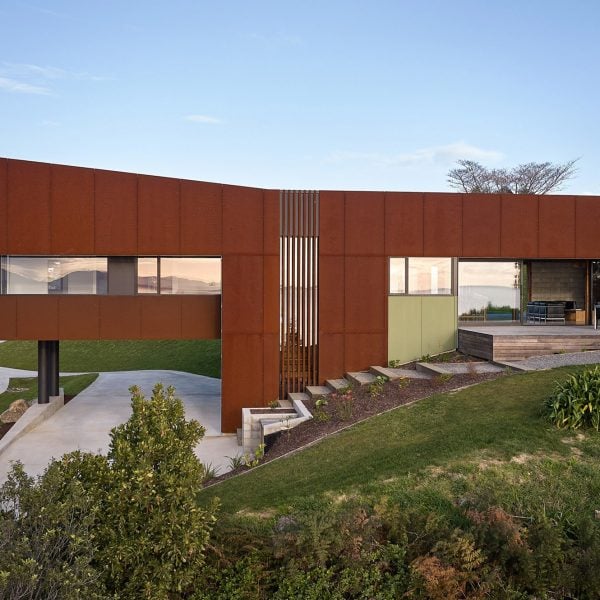 Ubicada en Ruby Bay, en el distrito de Tasmania, la casa consta de una estructura de madera, parcialmente elevada por un par de columnas, en respuesta a su terreno inclinado.