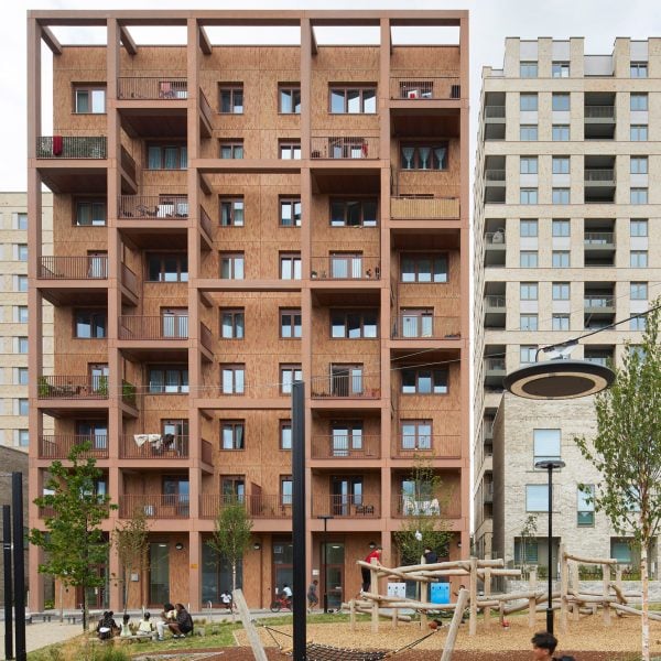 Vista exterior del edificio de apartamentos del este de Londres diseñado por White Arkitekter