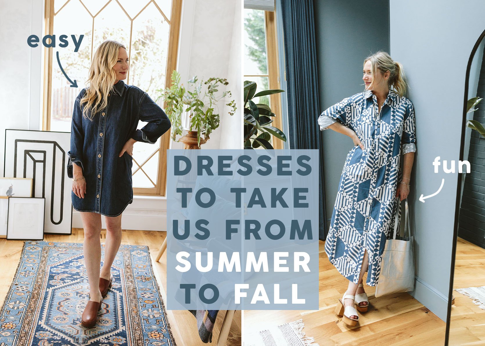 Estos vestidos camiseros de algodón tienen una vibra similar al vestido anterior, pero en una tela resistente a la intemperie más ligera y ligeramente más cálida. Como equipo de amantes de las rayas, creo que a estos dos les vendría bien su propia categoría especial 🙂 pero también ambos tienen otros colores sólidos que podrían ser más adecuados para el otoño, por así decirlo. Me encanta lo geniales y simples que son el corte y los detalles de estos. Cuando el caluroso sol del verano se enfría, unas botas quedarán geniales con unos vaqueros o una chaqueta de cuero.