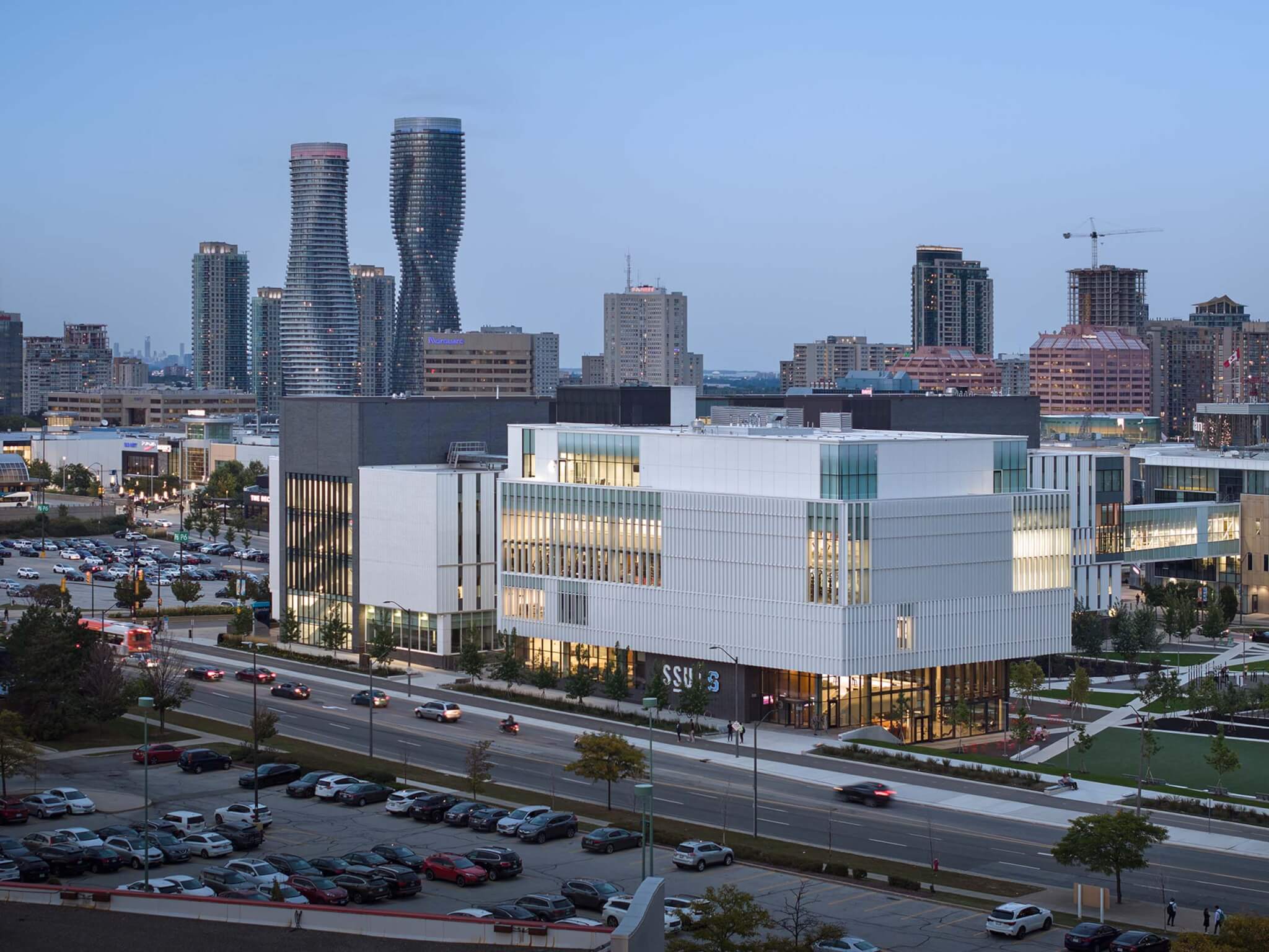 El campus recientemente ampliado está ubicado cerca del centro de la ciudad de Mississauga, centrado en automóviles, y está diseñado para ser amigable para los peatones e interactuar con el ámbito público. Dos nuevos edificios ceden casi la mitad del sitio a académicos‘ Green Park, un parque para estudiantes y público. Es importante destacar que el parque y todo el campus están ubicados en la intersección de 11 rutas de autobús y una línea de tren ligero planificada.