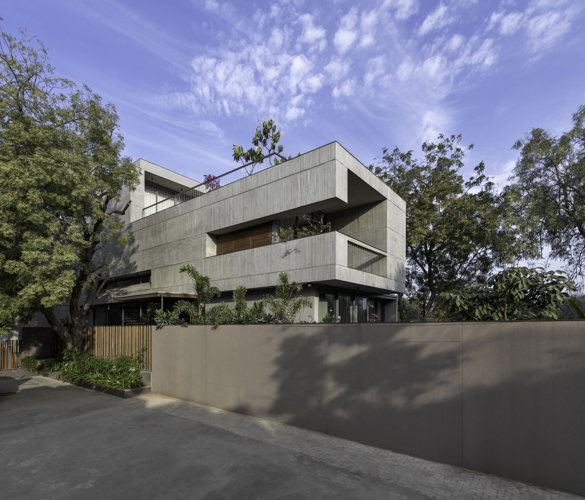La forma externa pretende formar una estructura distinta, creando espacios abiertos y aberturas que respondan a la granja al norte, la calle interna al sur y los jardines privados al este. Externamente, la casa se abre selectivamente en diferentes direcciones para reducir la ganancia de calor dentro de la casa. Abre más espacios sombreados que se convierten en fuentes de luz y ventilación, reduciendo la dependencia de la iluminación o ventilación mecánica. Además, se conservó el árbol de neem existente para beneficiarse de la sombra que proyectaría en el espacio de abajo y en las superficies verticales, haciendo el espacio más cómodo.