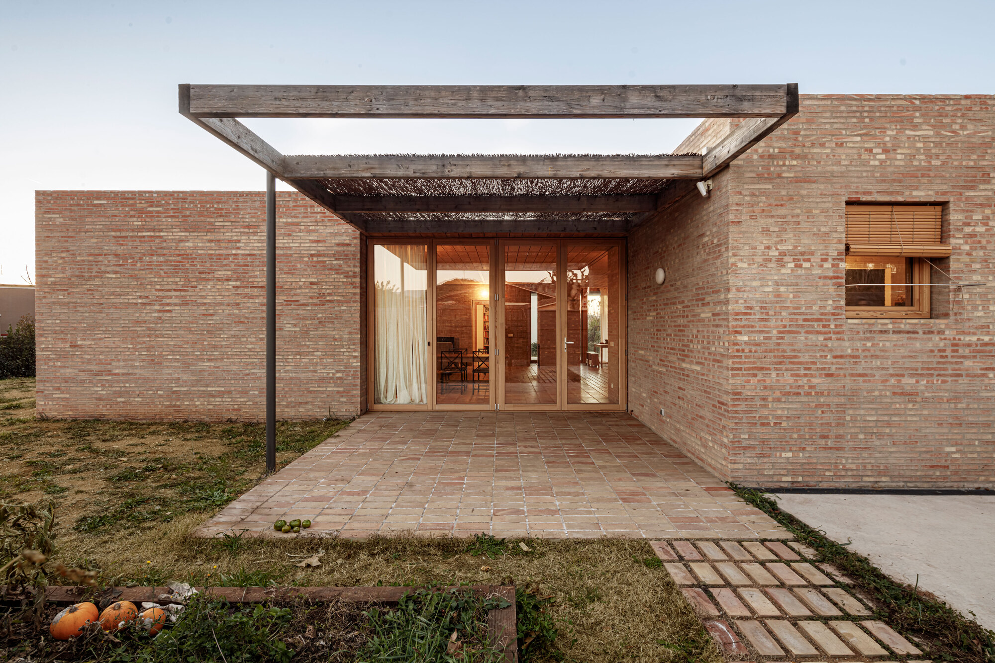 Azulejos cerámicos macizos hechos a mano del tamaño de Castilla regulan la chimenea y los cajones perimetrales que albergan las zonas privadas. Utilizamos los mismos ladrillos en los pisos de las áreas comunes para definir el módulo del espacio. Los muros cerámicos son los únicos elementos portantes verticales que sostienen todas las cubiertas de la casa. En el interior de la caja de ladrillo, la cubierta se construye con vigas metálicas y bóvedas cerámicas. En la zona de día y porche se utilizaron cerchas ligeras de pino.