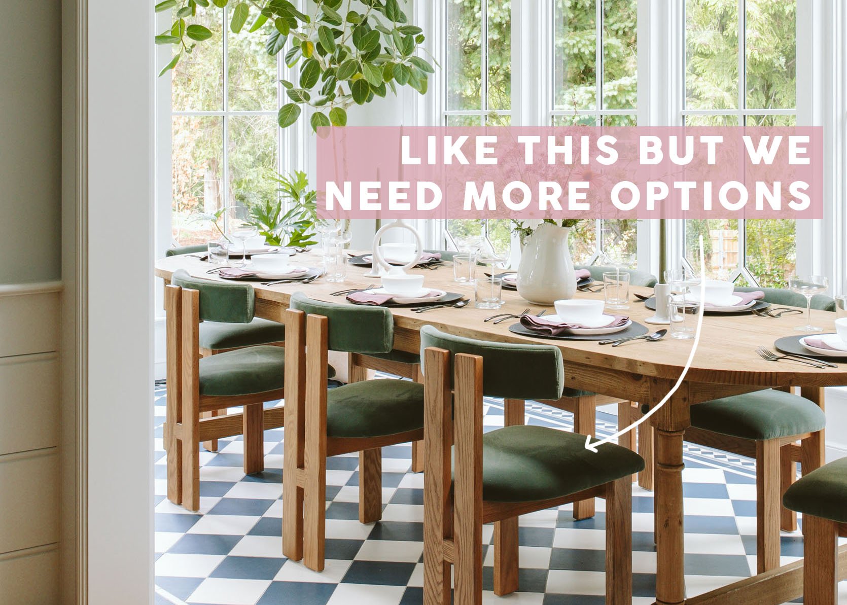 Es bonito, pero muy neutro, y el único color proviene de los árboles de afuera. Ahora, la cocina y la sala de estar tienen colores (honestamente, todo está por determinar), así que no puedo simplemente diseñar en una burbuja. Definitivamente me he inclinado por una silla negra durante mucho tiempo (no se han tomado decisiones hasta esta publicación), pero lo que realmente quiero es una silla colorida y estampada que no esté ocupada pero sí más interesante. Realmente no hay sillas prefabricadas en el mercado por menos de 1ka. Pero encontré una cantidad decente de sillas de comedor verdes, azules y rosas (básicamente colores no neutros) para aquellos de nosotros que soñamos con tener sillas de comedor tapizadas de colores (es decir, que no sean de madera o metal pintado).