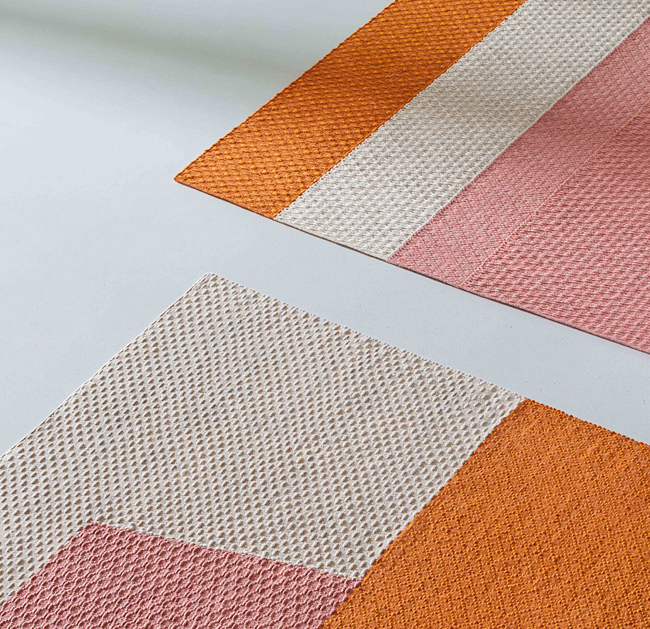 Los artesanos de GAN inicialmente lo imaginaron como piezas separadas que se tejerían juntas más tarde, y finalmente pudieron convertir los diferentes patrones de tejido en una sola pieza en el telar. Esto crea una mayor continuidad en el diseño, convirtiéndose en un tapiz ininterrumpido. Los diferentes patrones de tejido crean tonos fascinantes, similares a algunas obras de arte modernas. Los patrones forman cuerpos que interactúan en colores armoniosos que separan los diferentes tratamientos de hilo. Cada diseño de alfombra viene en dos colores, naranja y azul, para tonos cálidos y fríos respectivamente.