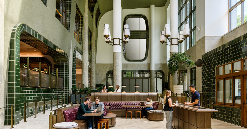 El U.S. Bank Center en Seattle muestra cómo se pueden usar mosaicos para crear puntos focales impactantes dentro de grandes espacios abiertos. El atrio del edificio, que alguna vez fue un área funcional pero aburrida, se transformó mediante el uso estratégico de azulejos de color verde oscuro. Los azulejos fueron cuidadosamente seleccionados para enmarcar y resaltar elementos arquitectónicos importantes como columnas y arcos. Su color y textura añaden una rica profundidad al atrio al tiempo que crean un lenguaje visual que guía naturalmente a los visitantes a través del espacio.