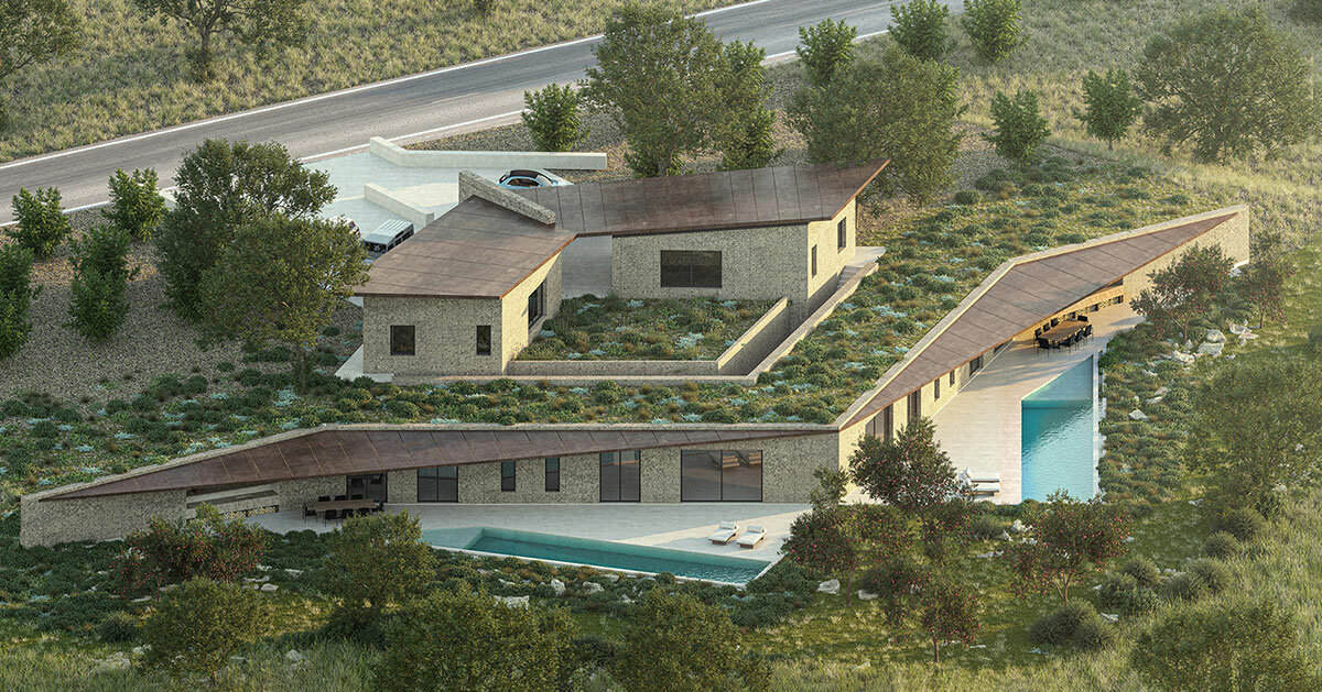 Casa invisible geotérmica revestida de corcho ecológica diseñada por Greek Dotn