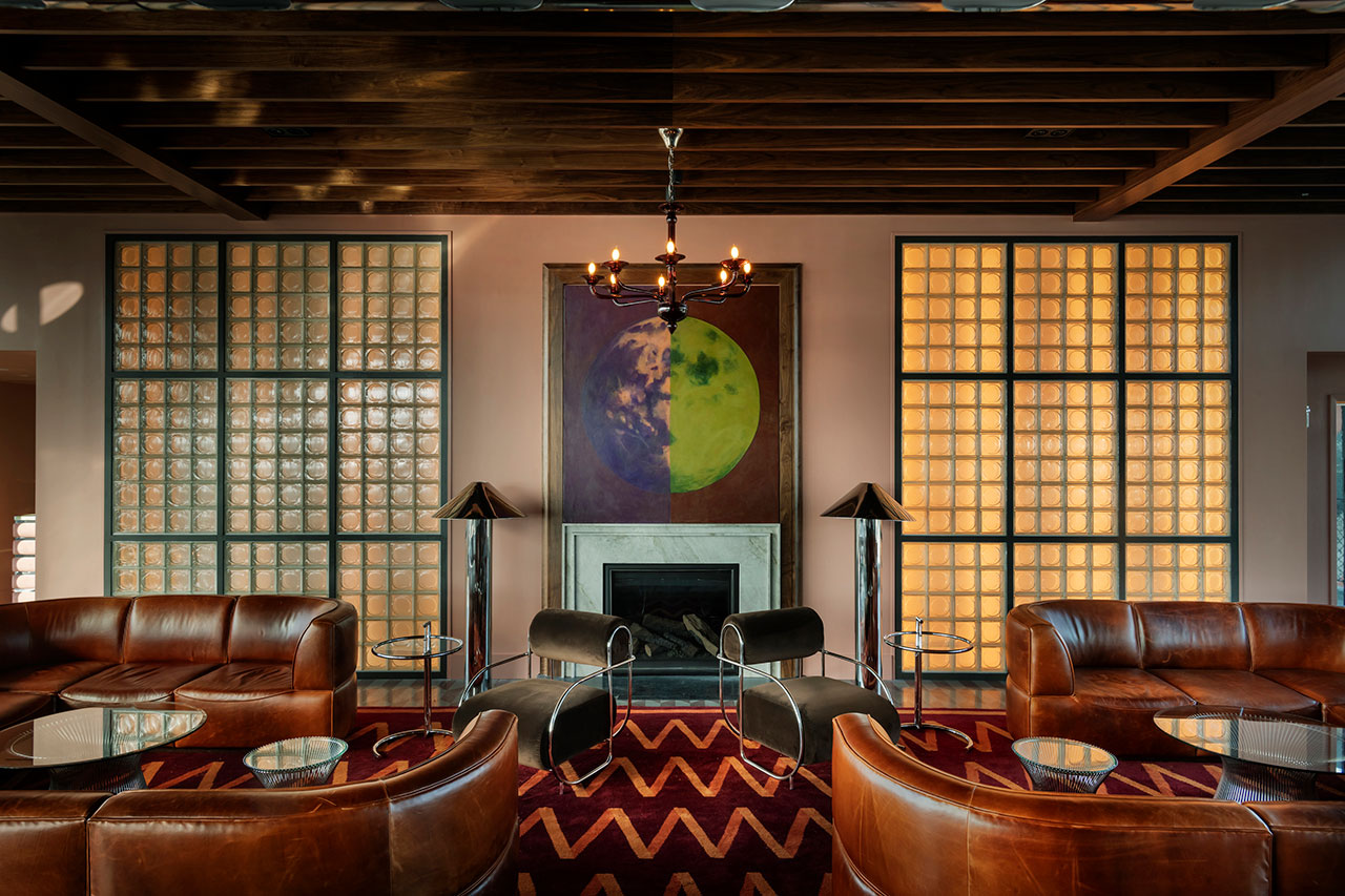 Dibujo de diseño: Escondido detrás de una fachada de hormigón visto, el edificio presenta un sofisticado interior moderno de finales de mediados de siglo con toques modernos inspirados en los años 1970. Ya sean habitaciones de huéspedes o instalaciones orientadas al público, estos espacios exudan una estética cinematográfica y de mal humor. Cabe destacar el salón de cócteles de la azotea del hotel, Moonlight. Cuenta con sofás tapizados con estampado de cebra y una chimenea de mármol adornada con un mural de «luna llena», que recuerda las enormes obras públicas en el cercano East Side Trail.