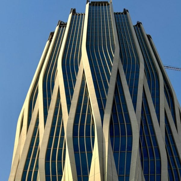 La imagen muestra el marco exoesqueleto torsional completo de la estructura de 170 metros de altura, que fue construida por Zaha Hadid Arquitectosahora el edificio más alto de la ciudad.