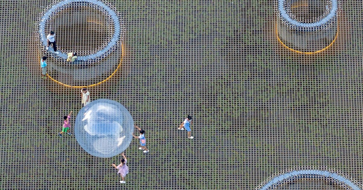 zxd Architects extiende una enorme red tejida sobre un estanque en una zona rural de China para invitar a la gente a descansar y jugar