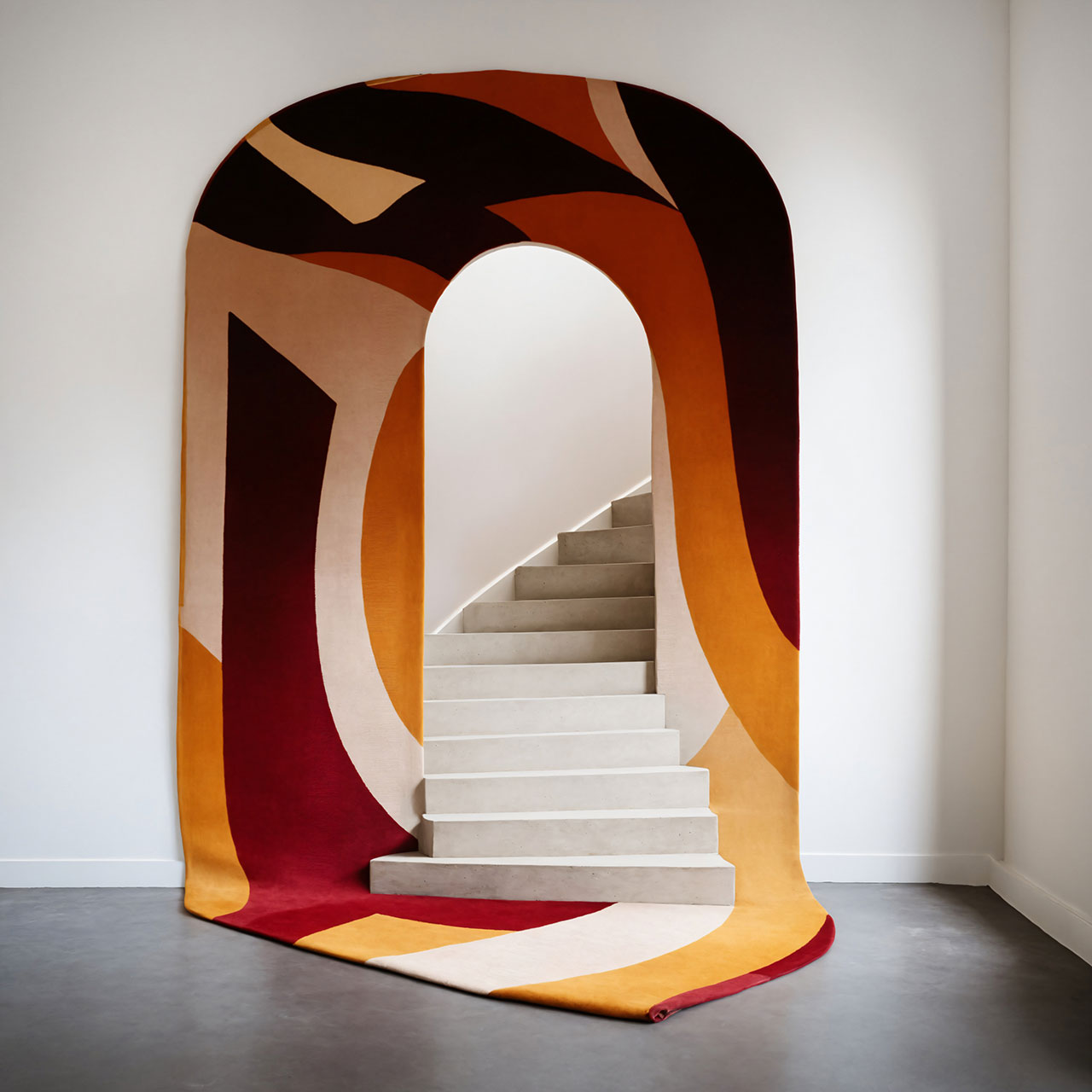 La colección también representa una recopilación de los intereses que Paddy ha cultivado durante la última década. Su trabajo más amplio investiga el poder transformador de las alfombras y tapices provocativos, particularmente en partes del hogar que, en muchos sentidos, están muy desatendidas y subutilizadas. «La puerta y la escalera simbolizan la exploración y la transición a un territorio nuevo y desconocido. Esto refleja lo que siento acerca de la dirección del estudio», dice Paddy. “Cada nueva idea es como entrar en un espacio desconocido y apasionante. Siempre surge algo nuevo y la energía es apasionante.