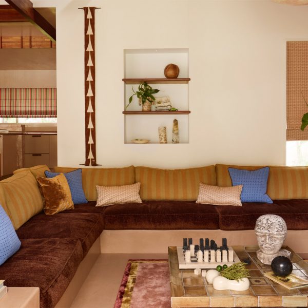 La iluminación y los accesorios añaden más capas de patrones y texturas al interior, con varios tonos de marrón que proporcionan un telón de fondo para elementos más expresivos.