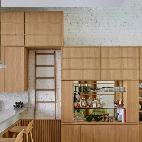 Esta escalera de madera está instalada a ras de la pared de ladrillos pintados en una cocina de estilo japonés en una casa adosada de Nueva York. Brooklyn comunidad, diseñada por la firma local Studio Vural.