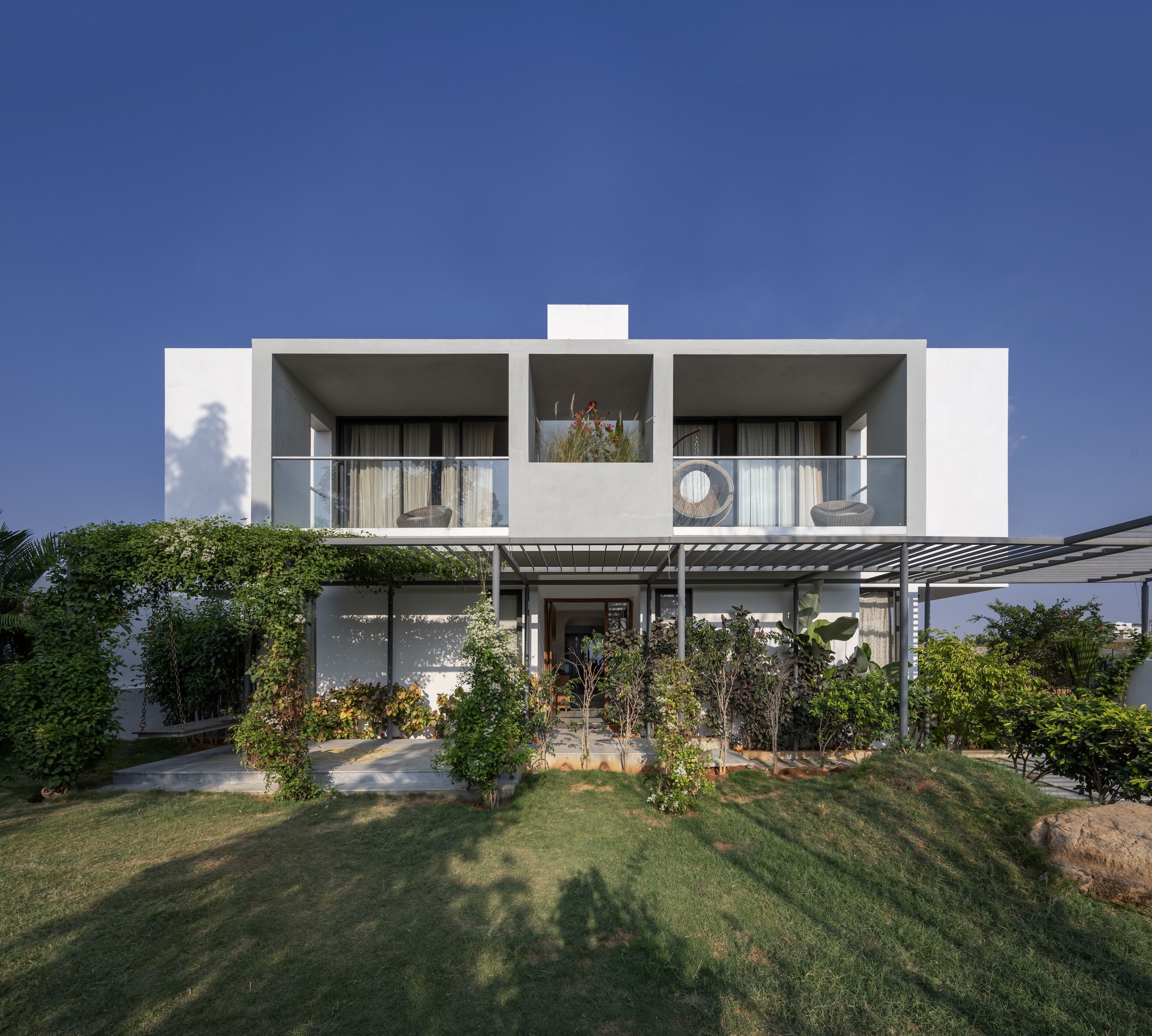 La casa tiene un eje central claro en dirección este-oeste cuando se ingresa a través de un pasillo sombreado con una terraza de entrada, que divide el primer bloque privado en dos dormitorios a cada lado y conduce a una sala de estar privada de dos pisos. El segundo bloque cuenta con un patio verde y una escalera que alberga servicios como tocadores, cuartos de servicios y eléctricos. Alojado en un gran volumen de casi doble altura. Se abre al patio trasero, difuminando los límites entre el interior y el exterior y mejorando la fluidez del espacio.