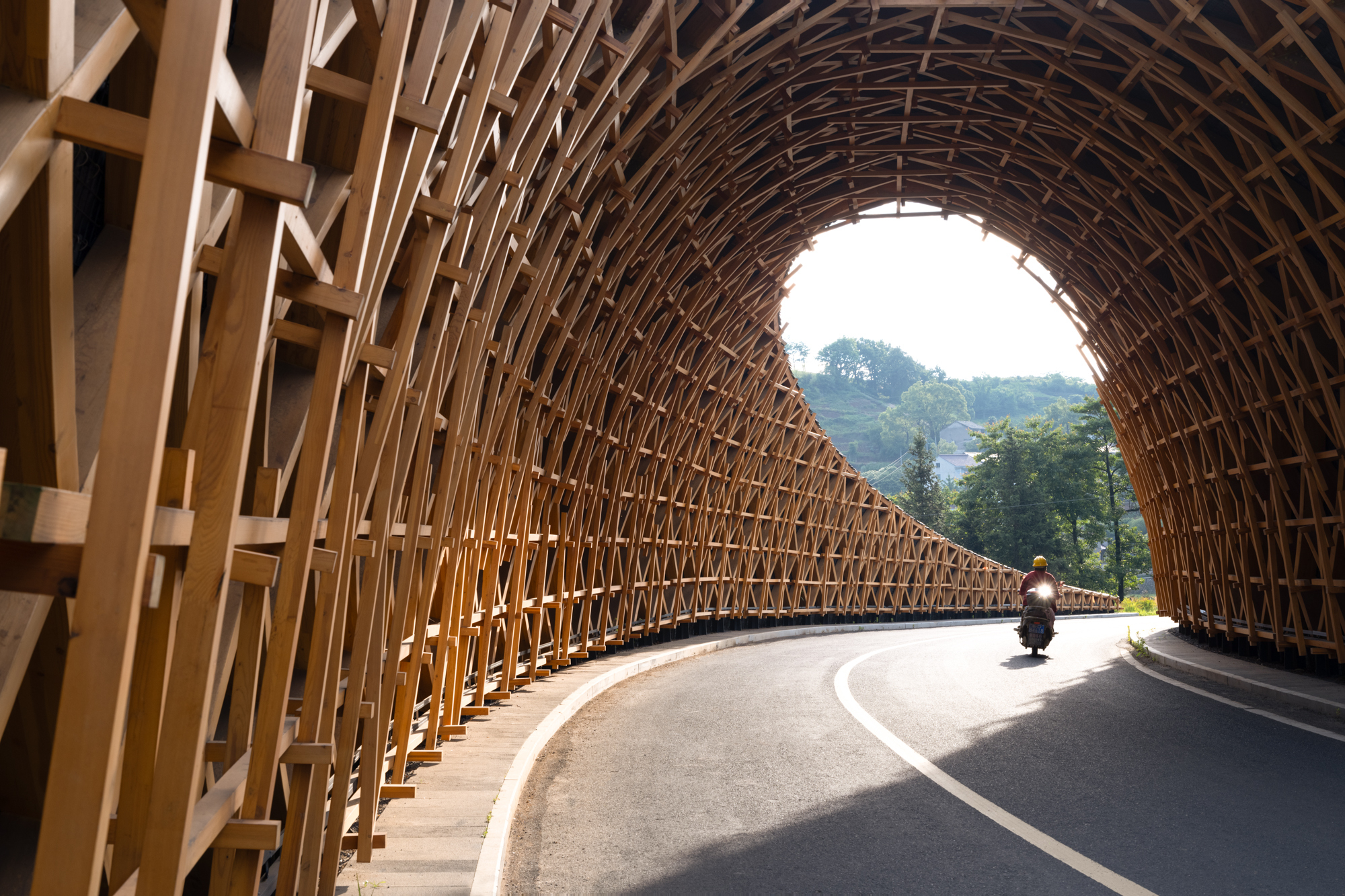 El diseño del canal sigue de cerca la pendiente de la montaña y se integra con los muros de contención de la terraza. Se utilizan materiales naturales para restaurar la pendiente original y lograr una construcción sostenible. El interior utiliza tecnología local de tejido de bambú, con la madera como soporte principal, mejorando la tensión visual y conservando la artesanía local. Externamente, el revestimiento de esquisto oscuro permite que el pasaje se mezcle perfectamente con el entorno natural y se convierta en parte de la cordillera.