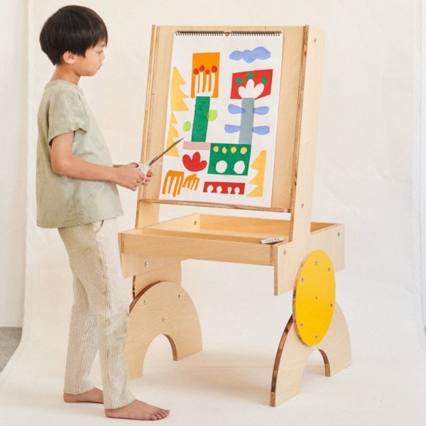 Para captar la atención voluble de los niños, Woset se asoció con Shin Okuda de LA Studio waka waka Cree un caballete de madera contrachapada que sea lo suficientemente llamativo como para convertirse en parte de los muebles en lugar de algo guardado.