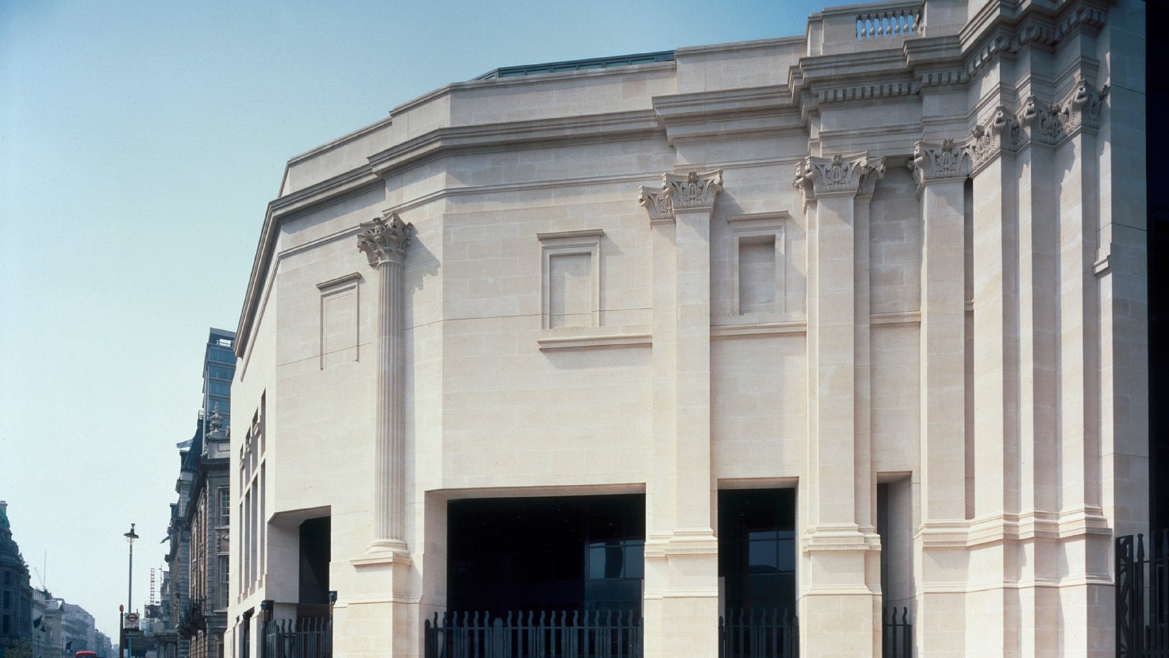 «John Sainsbury creía que las vistas debían estar lo más despejadas posible y consideraba que columnas adicionales ocultarían las entradas a la sala de conferencias y a la galería de exposiciones temporales y confundirían a los visitantes».