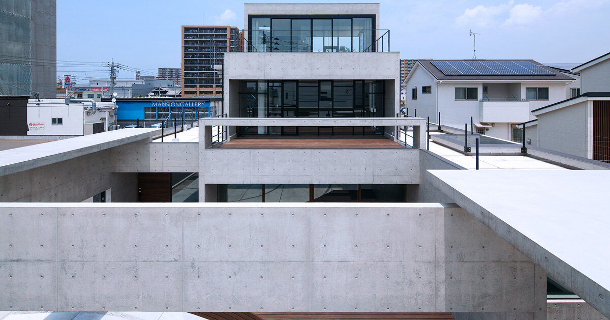 Las casas de la ciudad de Fukutsu están rodeadas de aleros de hormigón y paredes colgantes.