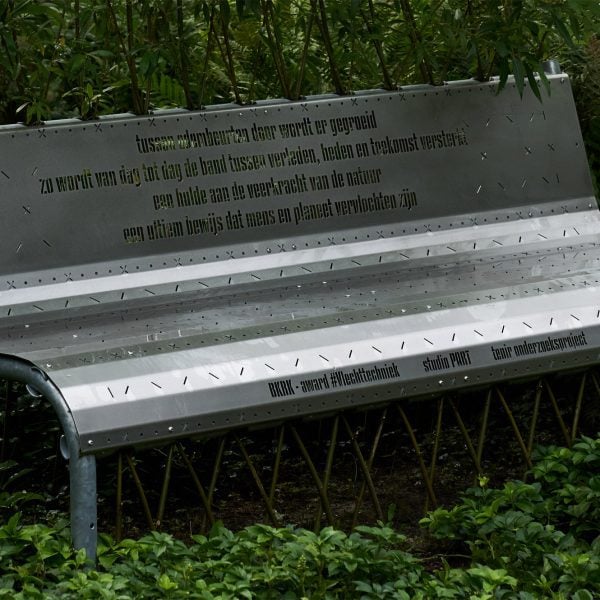 Inicialmente, se añadió una tapa de metal a la parte superior del encofrado para crear un banco funcional desde el primer día y al mismo tiempo proteger el sauce en sus primeras etapas de crecimiento y desalentar las ramas laterales no deseadas.