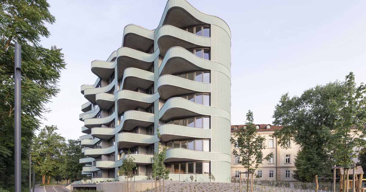 Un edificio residencial moderno con balcones ondulados y un exterior revestido de azulejos de color verde menta.
