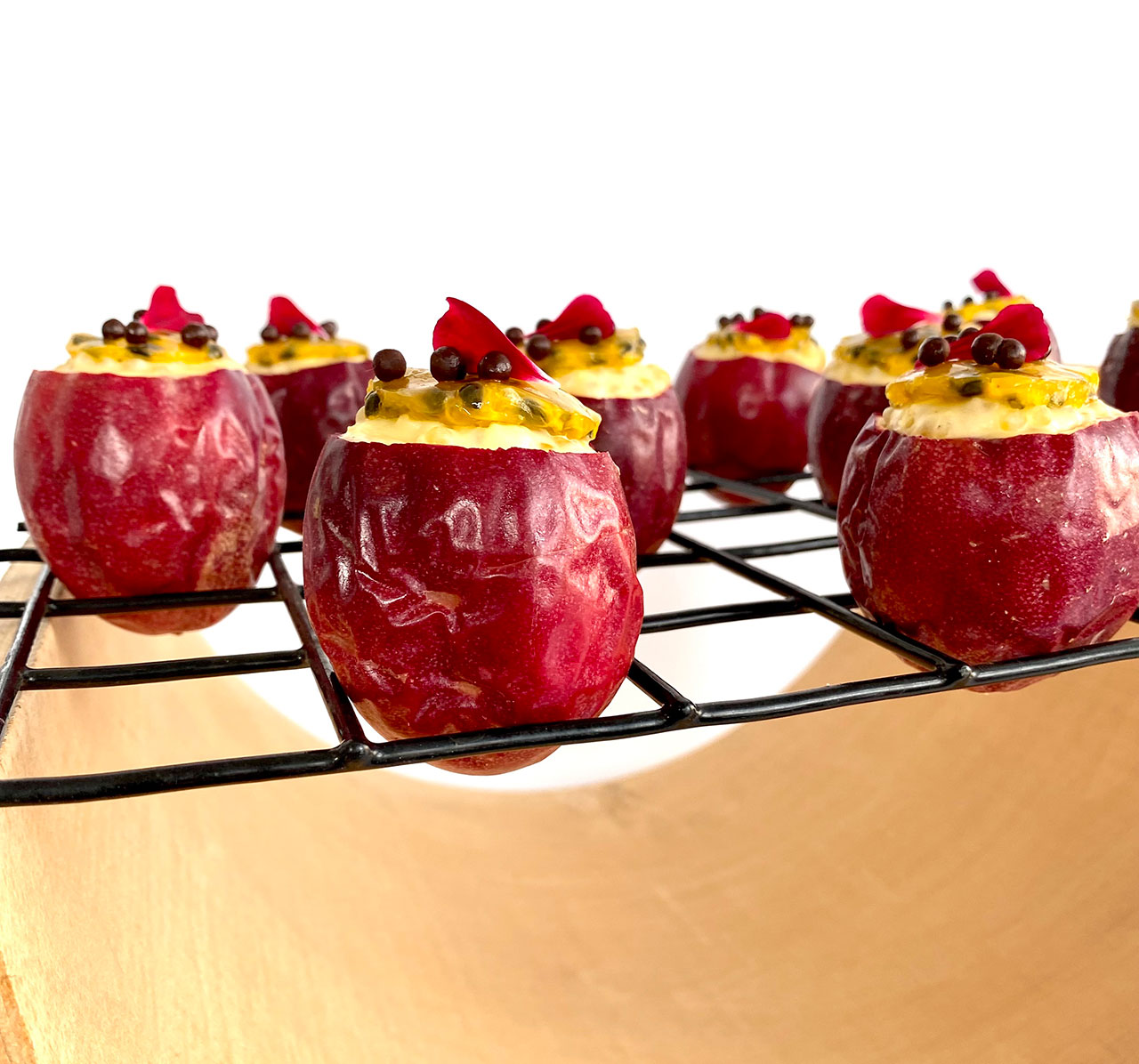 Este postre se puede servir fácilmente en vasos individuales o en tazones grandes y poco profundos. Dicho esto, me gusta rellenar la cáscara hueca de maracuyá con tapioca cremosa y luego cubrirla con rodajas de gel de maracuyá. La experiencia de sostener la fruta con hoyuelos mientras se enrollan perlas de tapioca con sabor a coco en la lengua agrega diversión a la experiencia gastronómica y genera conversación entre los invitados.