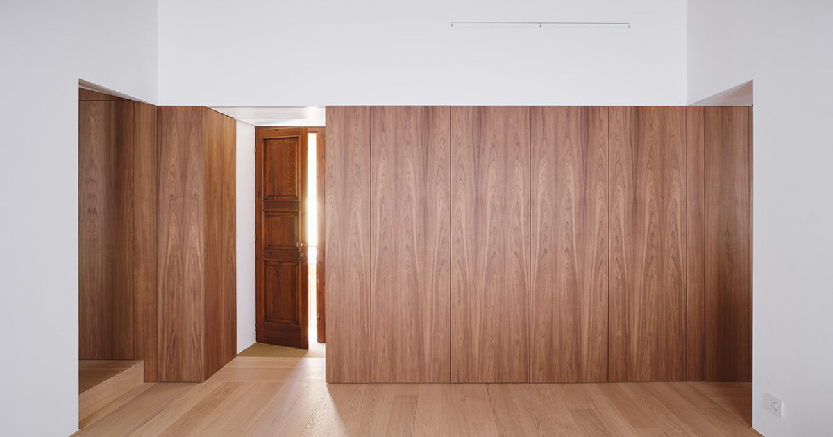 situacional Rejuvenecer Apartamento de finales del siglo XIX y principios del XX. patio El edificio está ubicado en el sitio de Porta San Biagio, una puerta histórica que una vez marcó la transición entre el núcleo urbano de Monza y Italia, y sus alrededores. El proyecto reinterpreta el papel histórico de la arquitectura como umbral, ahora mediando espacios internos y externos dentro de un contexto doméstico. Al centrarse en el concepto de umbral, el diseño cambia la dinámica del espacio. departamentoenfatizando la transición entre la esfera pública y la privada. La paleta de materiales utiliza tonos cálidos expuestos para complementar la organización espacial racional. de madera Las vigas, los armarios de nogal Canaletto y los suelos de roble crean un ambiente cohesivo. Las puertas corredizas corredizas en umbrales clave permiten transiciones flexibles entre espacios, mientras que el diseño general equilibra la relación entre lo antiguo y lo nuevo.